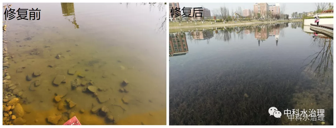 修復后:工程施工結束后,湖面水色正常無異味,水面無藻類、無浮萍、無垃圾、無臭味,水邊能清澈見底,水體透明度≥2.0米已上。水質主要指標(總氮、總磷)含量優于國家《地表水環境質量標準》(GB3838-2002)地表水Ⅲ類標準。